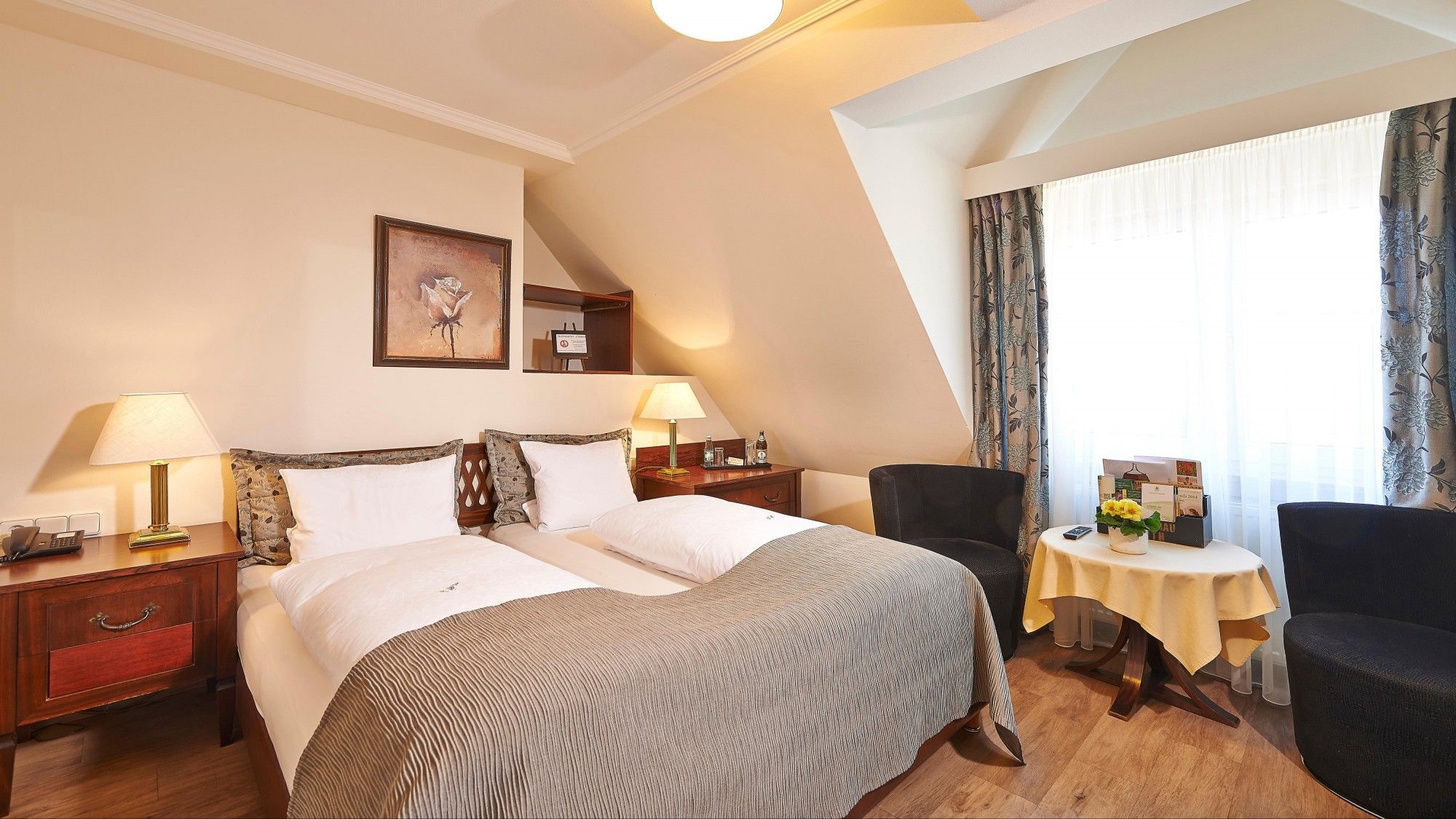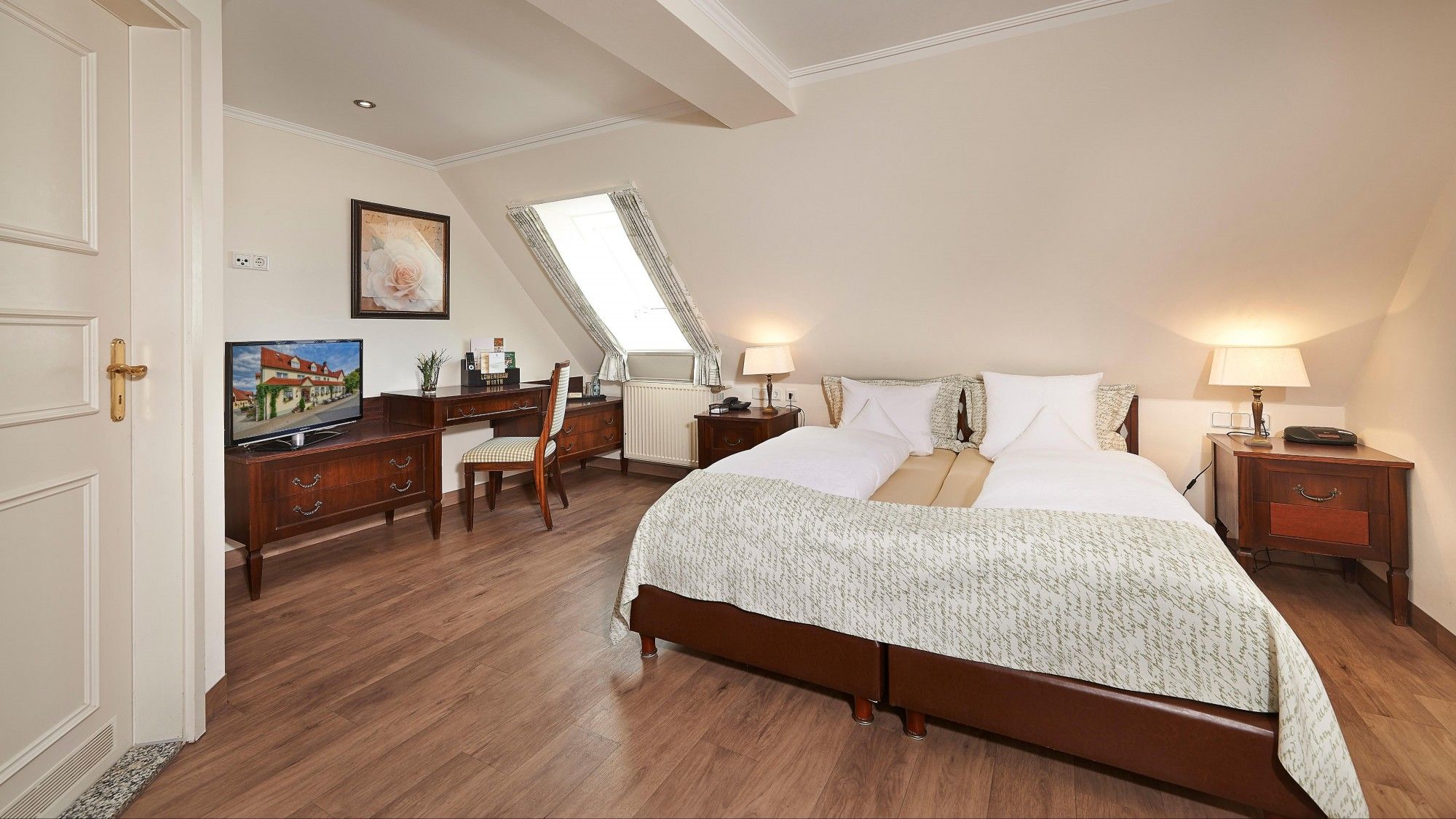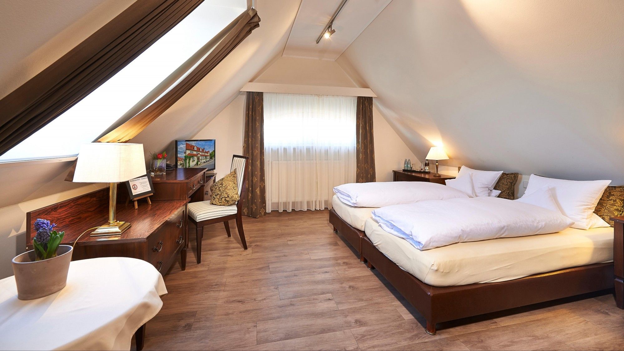 Zimmer „Wirtshaus“ mit Dusche, WC, Bettgrößen von 80/90/100 * 200cm, 32“-40“ Flat-TV mit Satellit-Empfang, Telefon, Föhn, teils Teppichboden, teils Design-Fußboden.