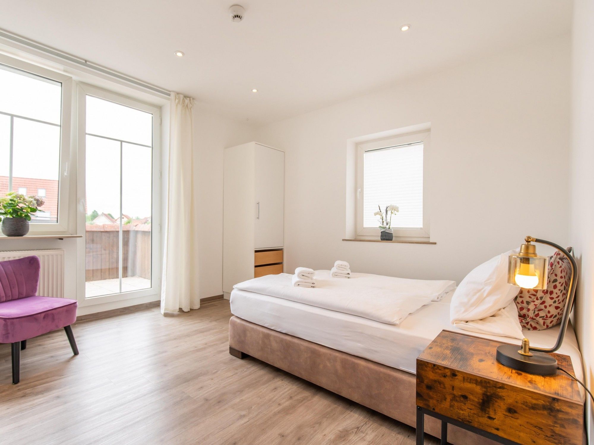 2 Schlafzimmer (1 Doppelzimmer | 1 Zimmer mit Queen Size Bett 1.50m*2.00m) mit Balkon und kleinem Schreibtisch, 1 Badezimmer mit Badewanne & Dusche
