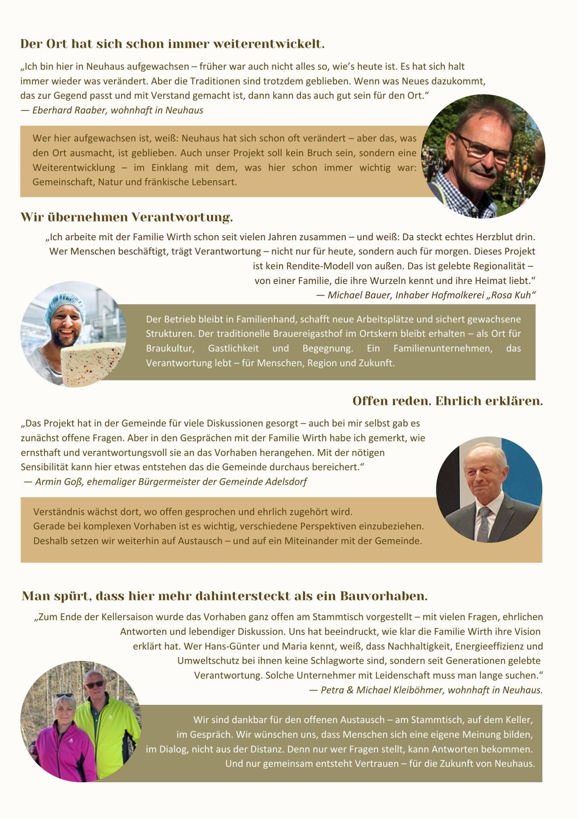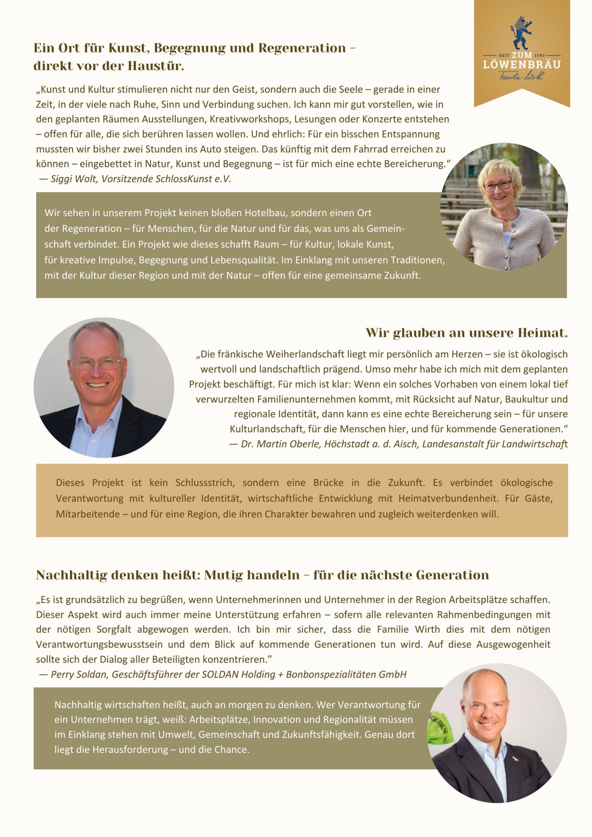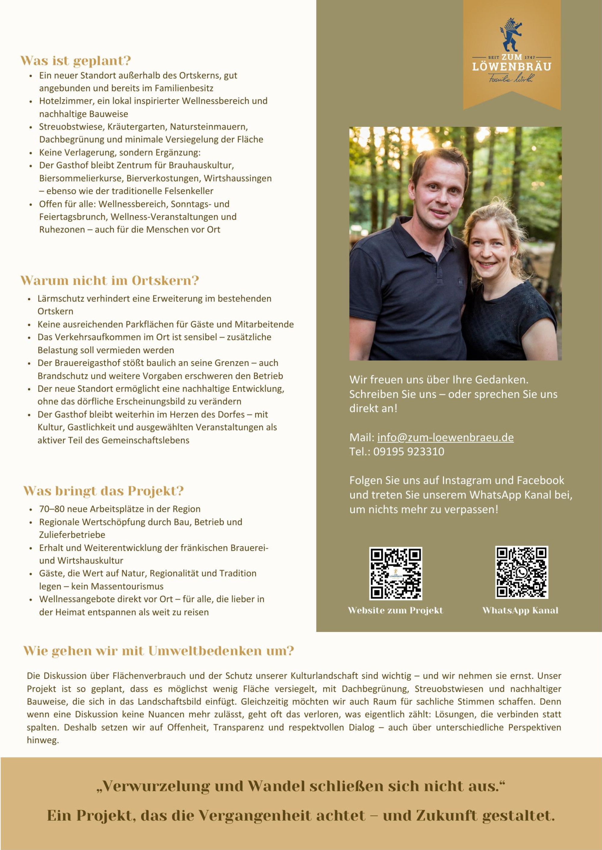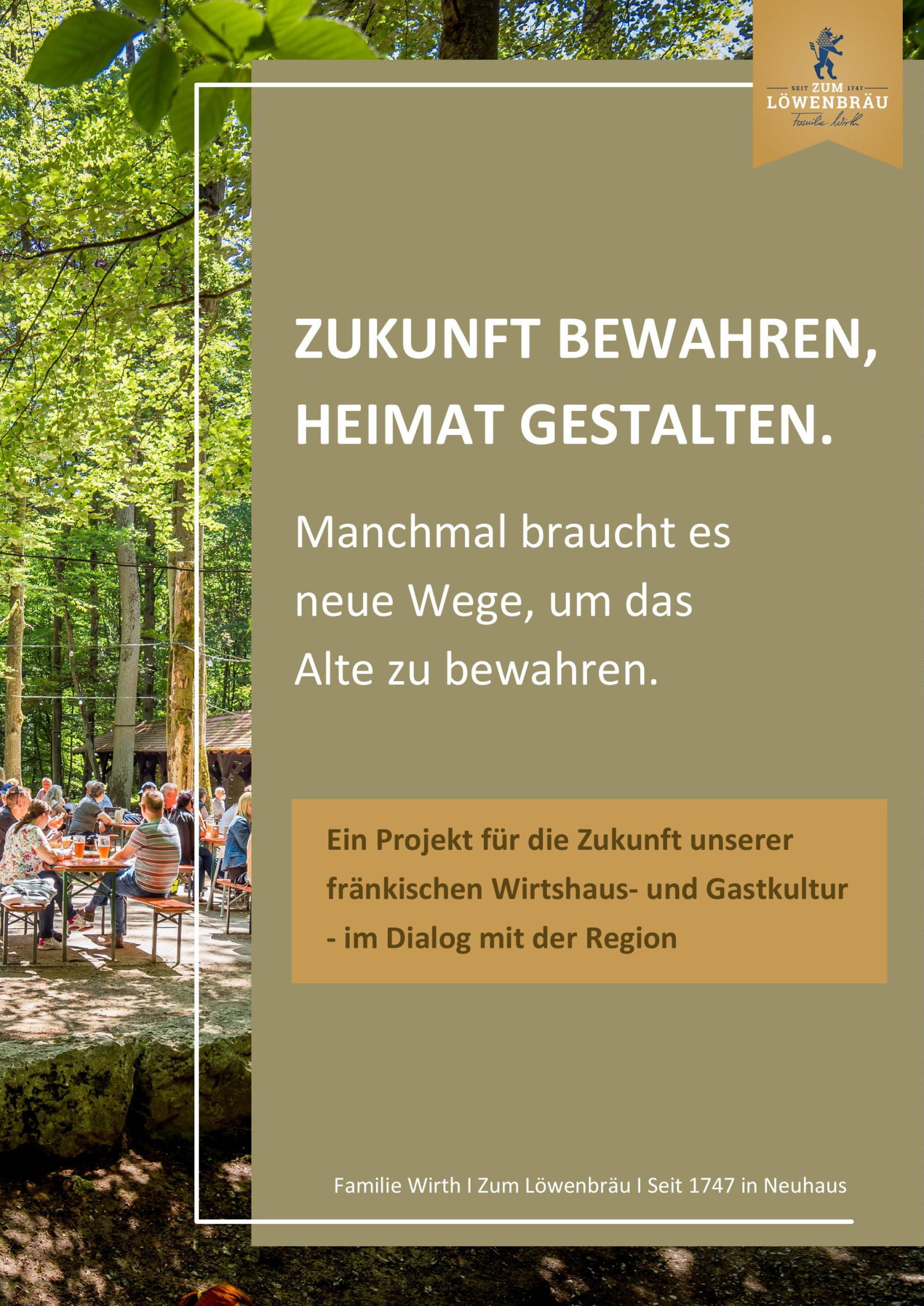 Unsere Heimat ist das, was uns prägt, verbindet und Kraft gibt – über Generationen hinweg. Doch Heimat lebt nicht vom Stillstand, sondern vom Wandel im Einklang mit dem, was bleibt. Unser Familienunternehmen, der Brauereigasthof Zum Löwenbräu in Neuhaus, steht seit 1747 für fränkische Wirtshauskultur, Gastlichkeit und gelebte Tradition. Mit unserem Zukunftsprojekt möchten wir einen behutsamen Schritt in die nächste Generation gehen – im Dialog mit der Region, getragen von Verantwortung für Mensch, Natur und Gemeinschaft. Dabei geht es uns nicht um einen einfachen Hotelbau, sondern um einen Ort, der Erholung, Kultur und regionale Identität miteinander verbindet. Offen, ehrlich und gemeinsam wollen wir diesen Weg weitergehen – für Neuhaus, für unsere Heimat und für die Menschen, die hier leben und zu uns kommen.